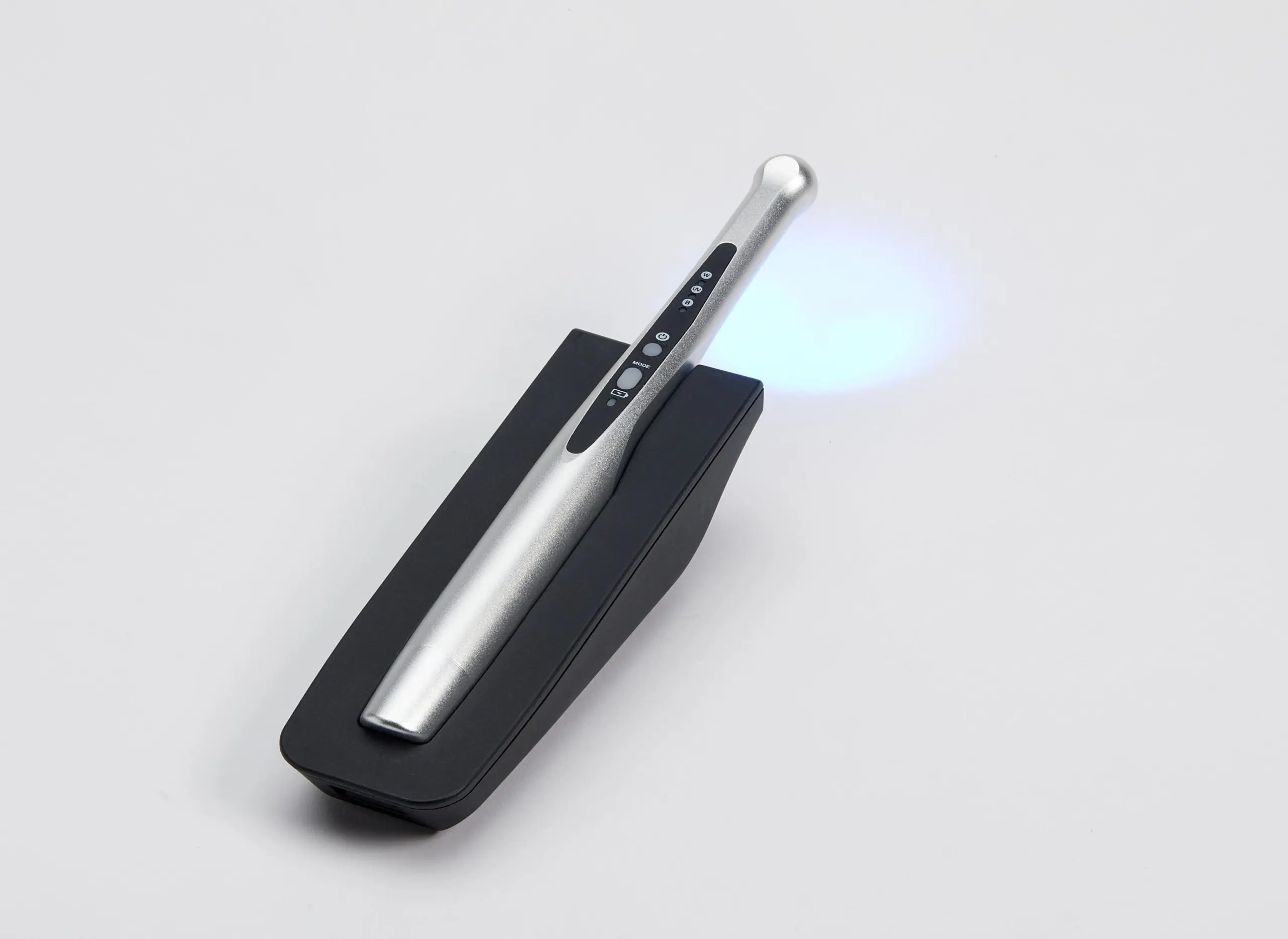 We began by researching the various dental composites and learning how quickly each reacts to curing light. This led us to specify that the head must contain LEDs of differing wavelengths to ensure full curing for any composite formulation. We then designed an array of 7 high-powered LEDs - some with blue light and others with UV light. We also added an 8th light to the head to serve as a flashlight for diagnostic inspection.